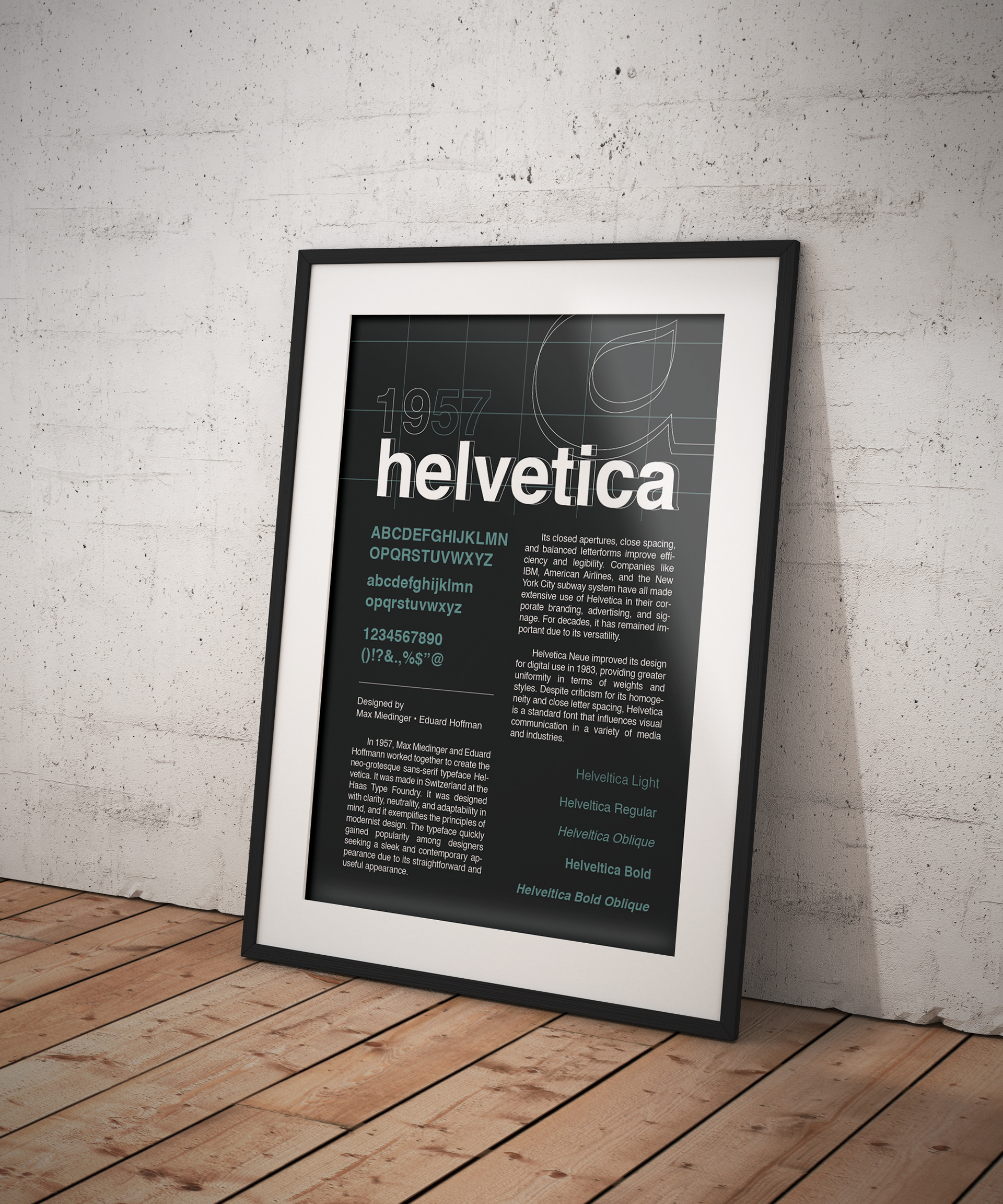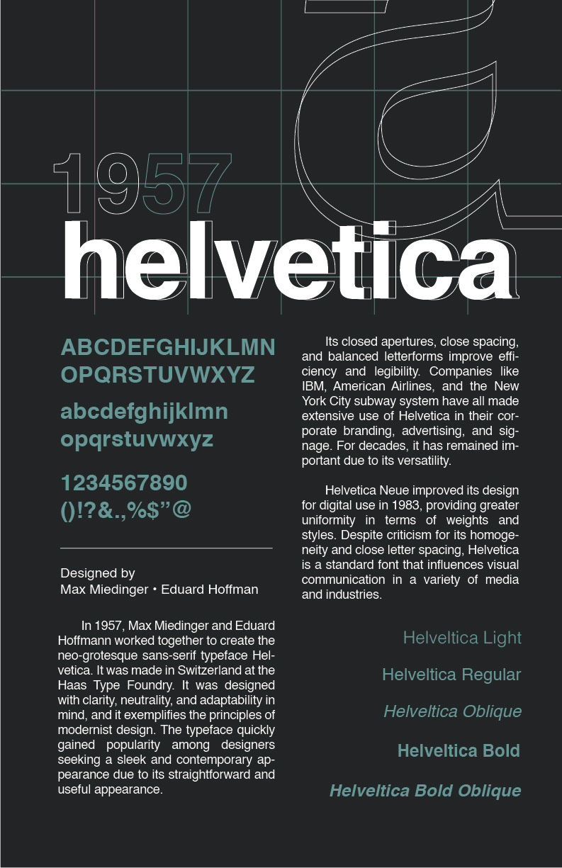 Helvetica feels modern, clean, and easy to read. The typeface is used everywhere, from branding to signs, and its simple design makes it reliable in almost any setting. A clear example is the New York City subway system (MTA), which uses Helvetica because it stays readable and consistent. Overall, the typeface fits the look I wanted and represents a straightforward, modern style.