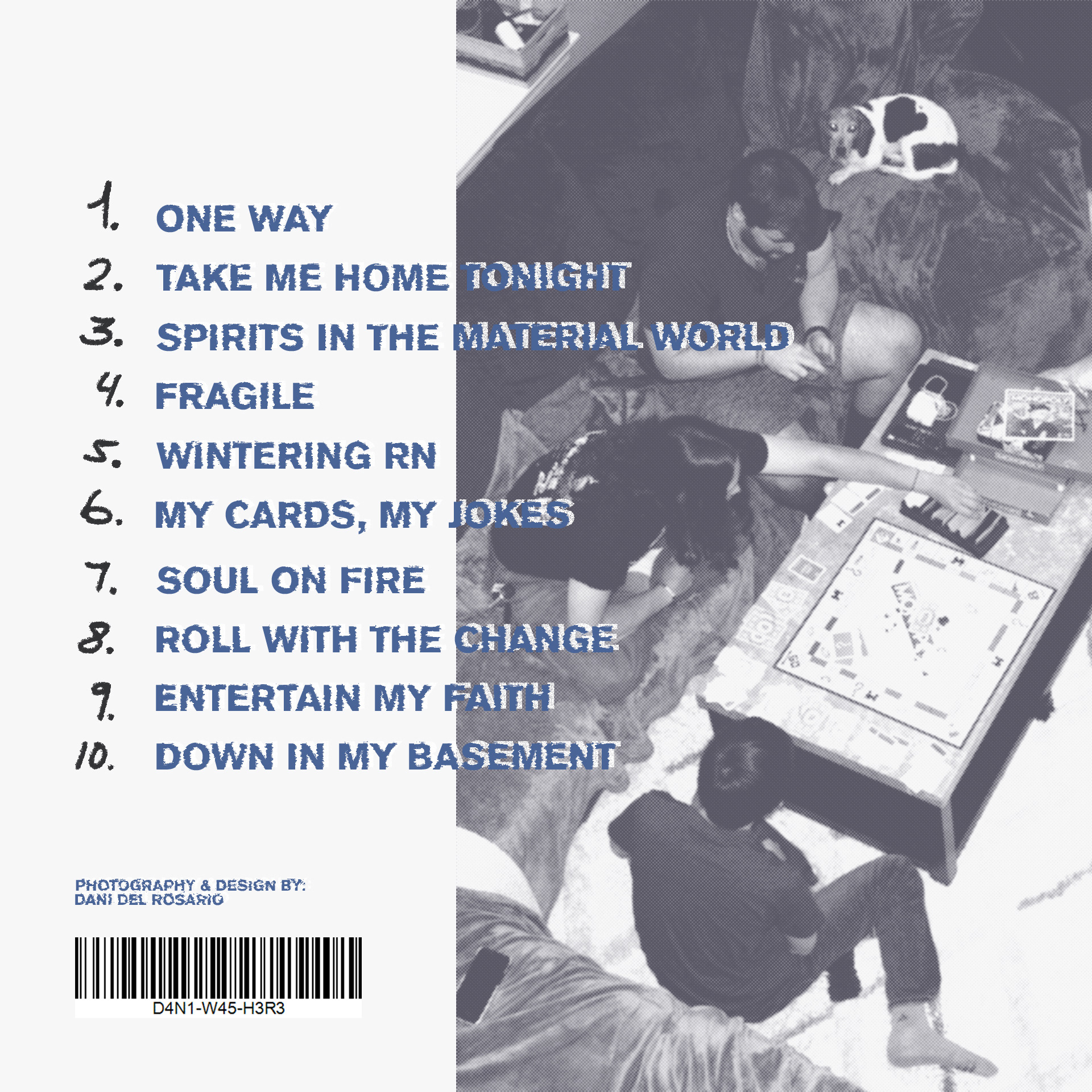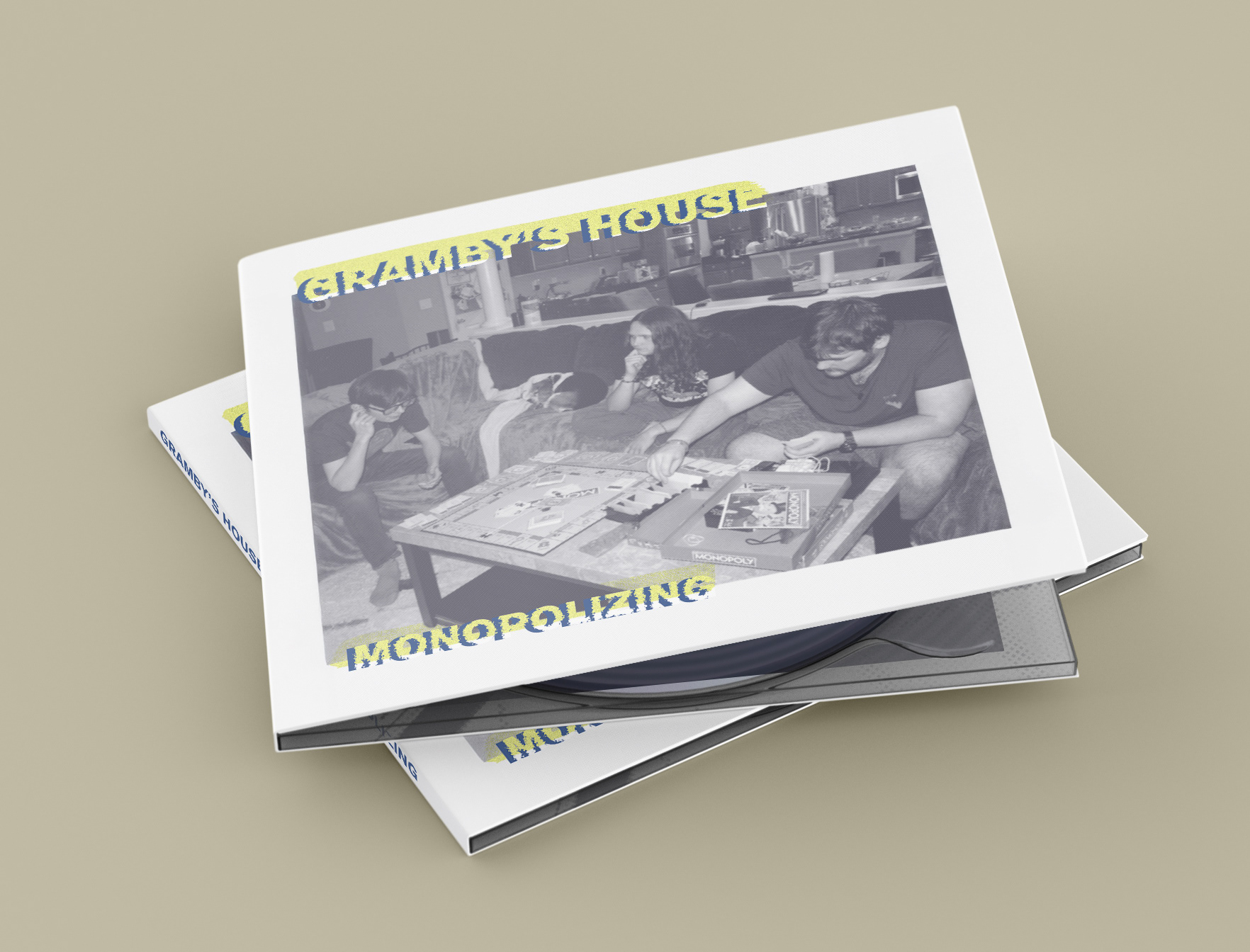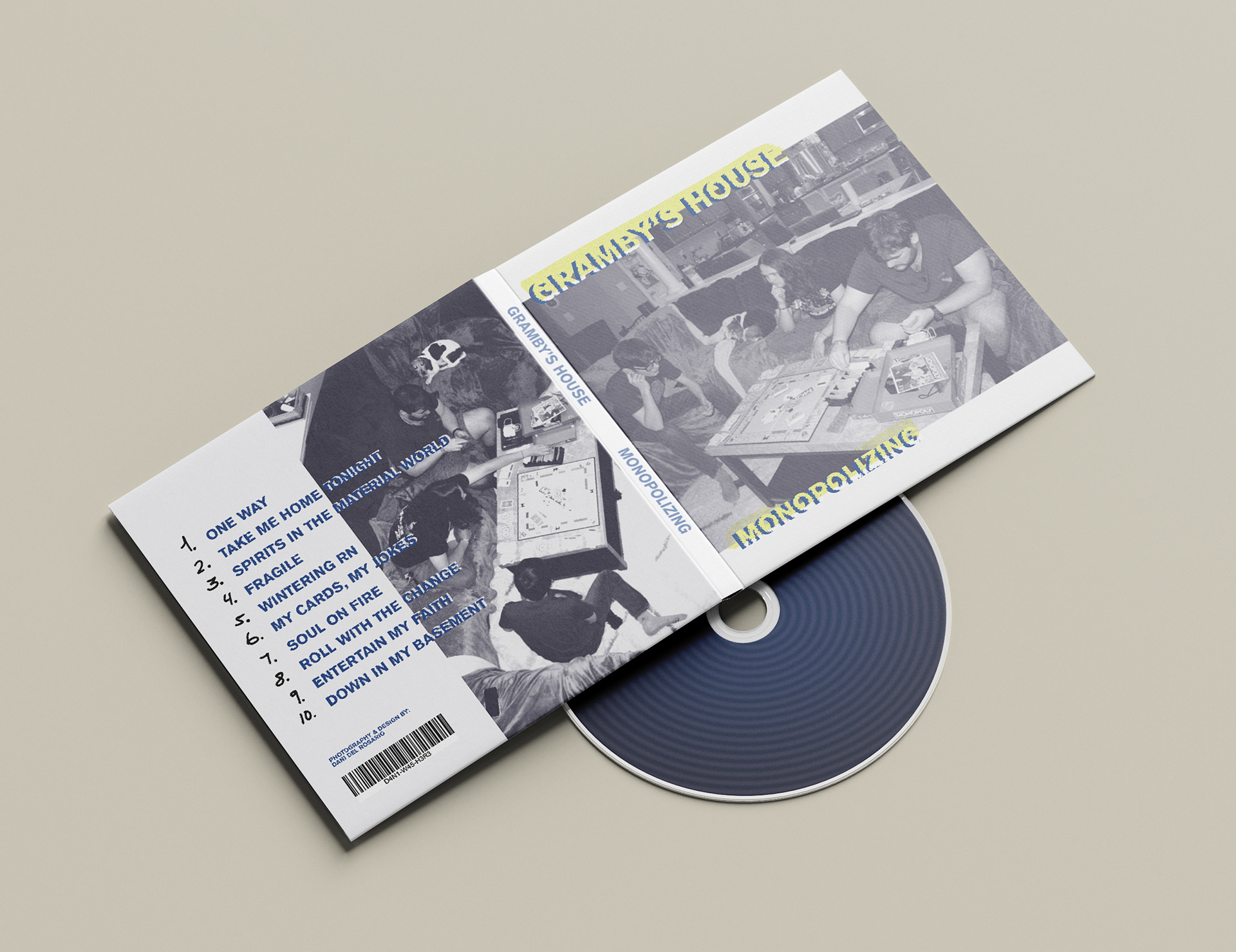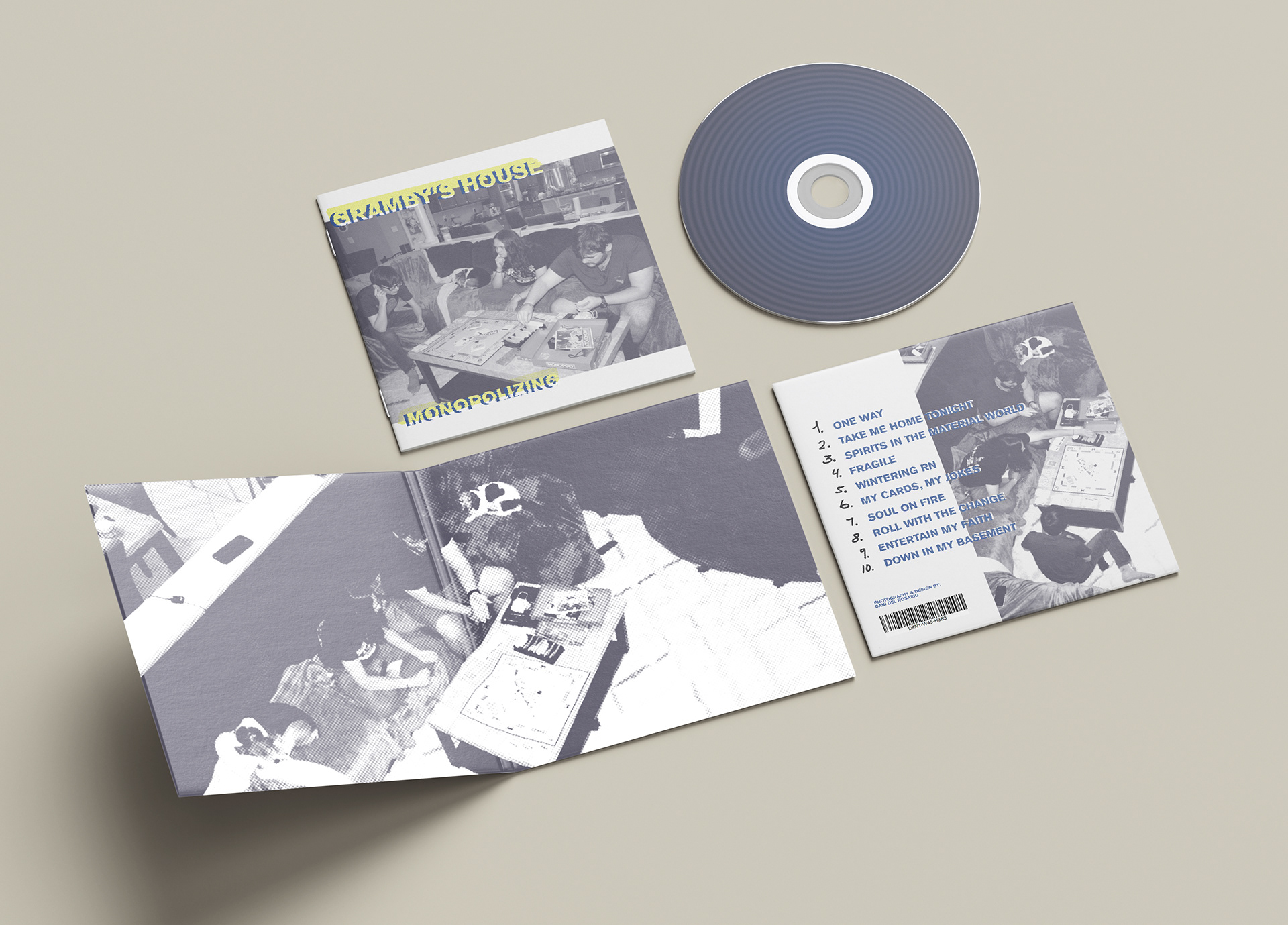 When creating the CD Cover, I photographed my close friends behind the scenes to make the images look natural and unposed. The front cover shows them playing Monopoly with a halftone filter added for a textured, retro effect. The back cover keeps the same relaxed mood with the song names listed. I experimented with several sans serif typefaces to find one that matched the casual and simple style of the design.