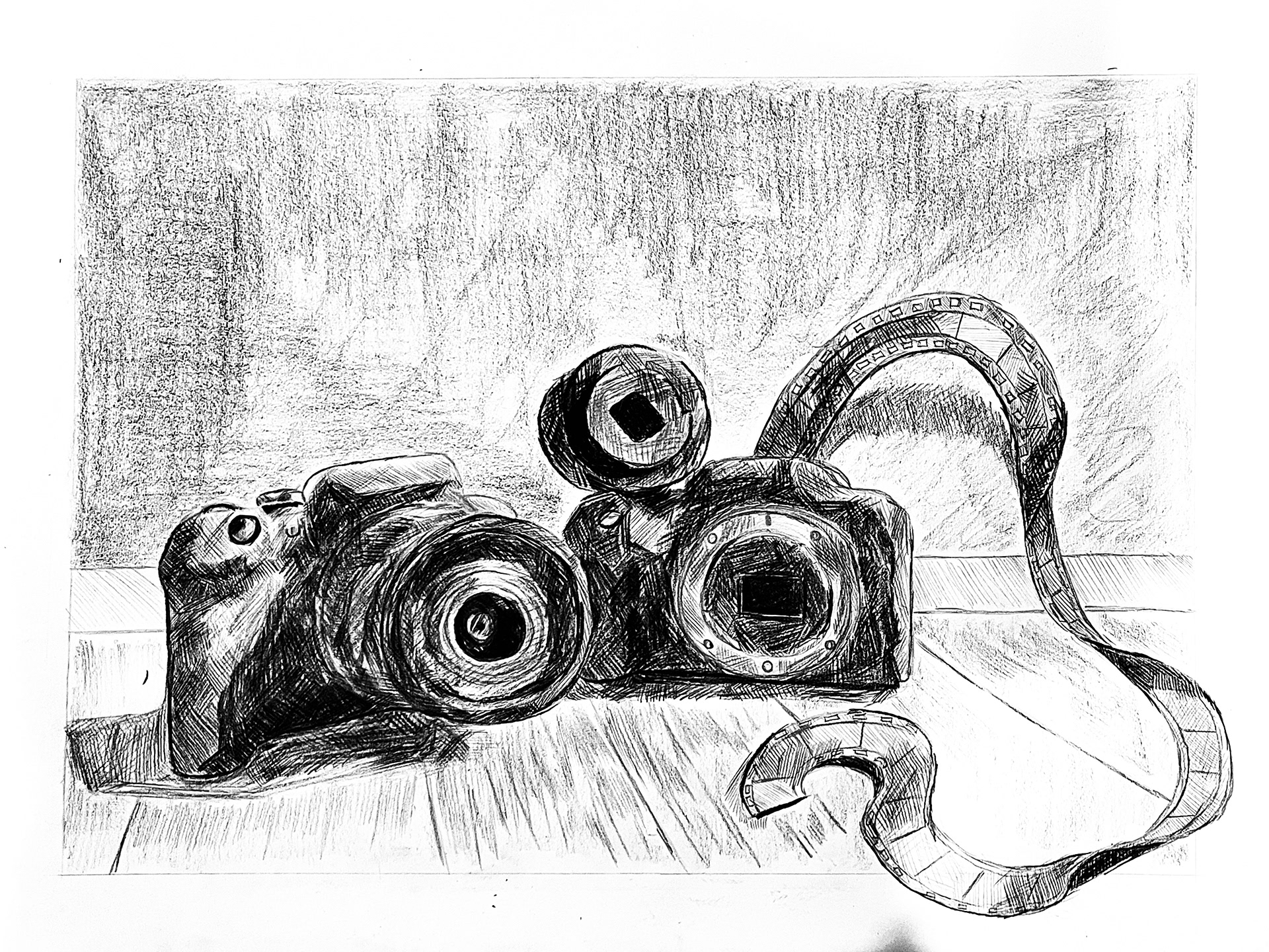 I drew a camera to capture its composition, that shows both the inside & outside. When creating this piece, It seemed like I was more interested in looking at the complex inner workings, and recognizing that they differed from the outside shape.