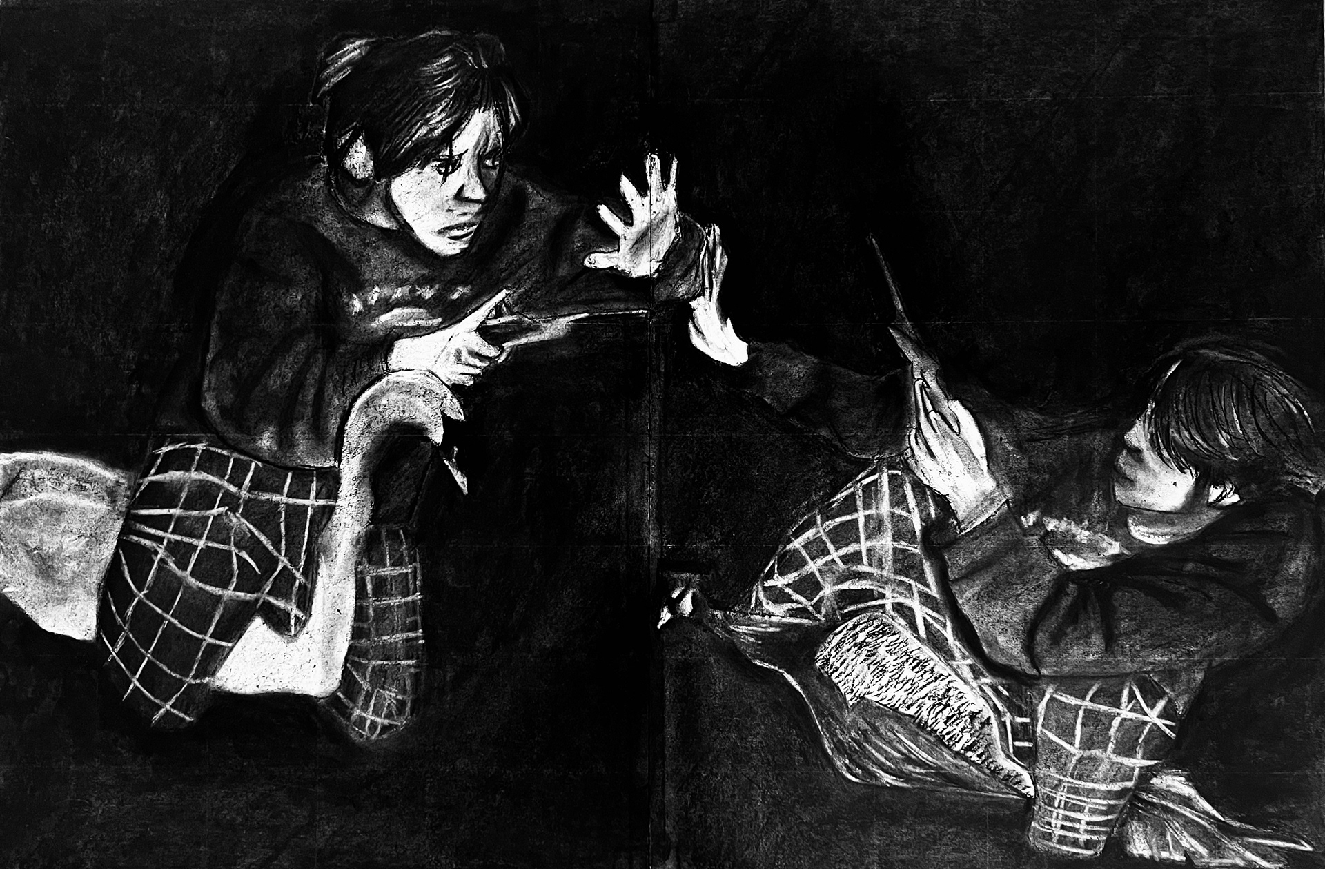 I was inspired by Ida Applebroog's work as she uses simple contour that allows the viewer to instantly recognize shapes & objects. I used charcoal to create this piece as I should it would be easier to contour, and get in depth with the animals, and myself in the peice; a peacock, a swan, a gun, and myself. Combining things in a piece felt weird however, it felt like I just formed a relationship.