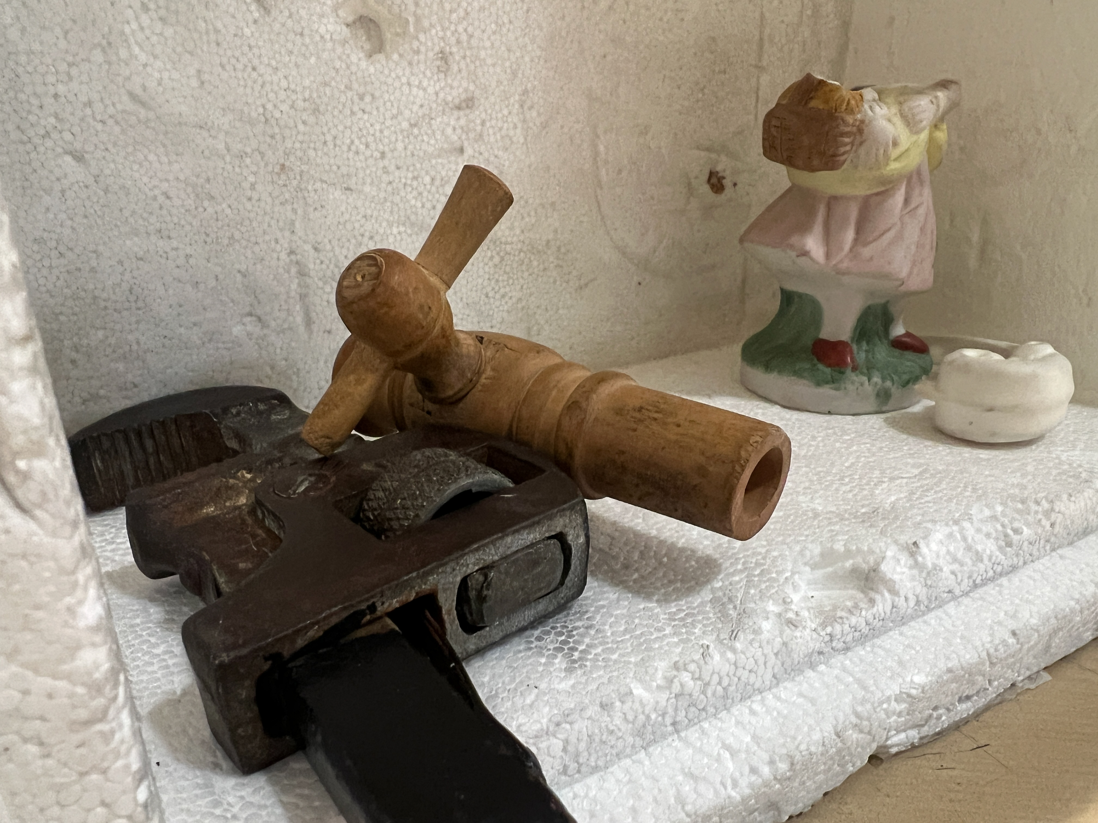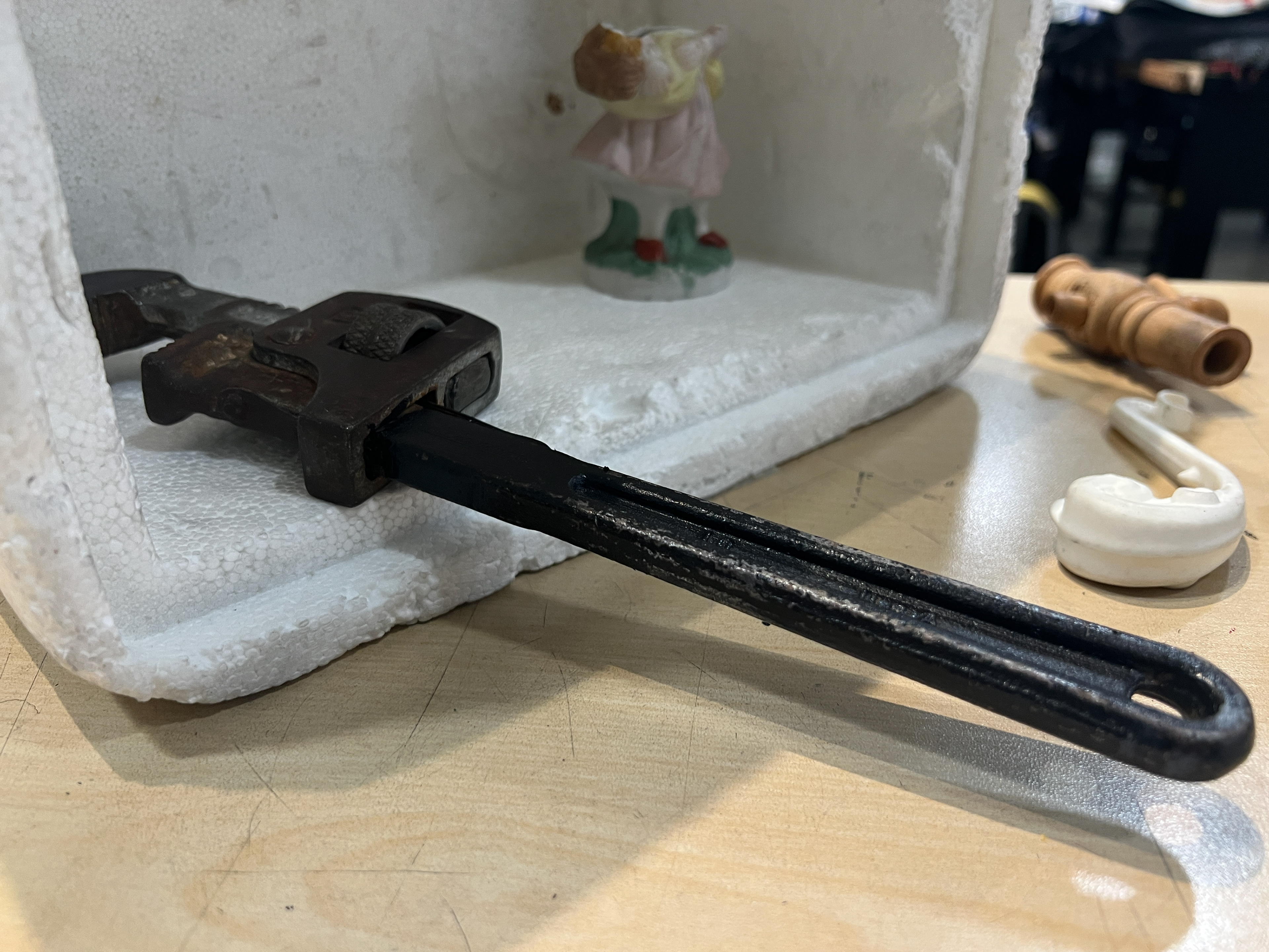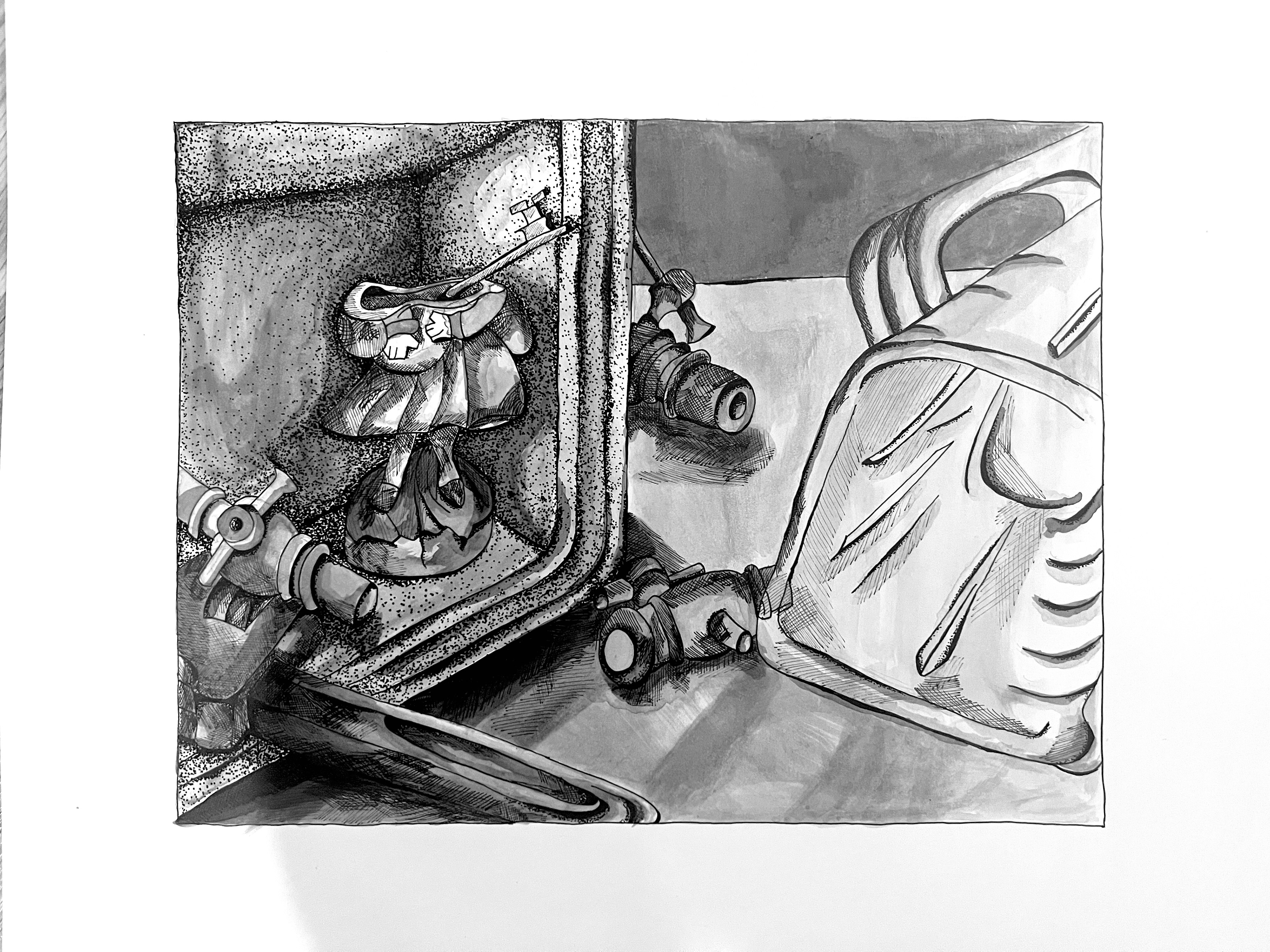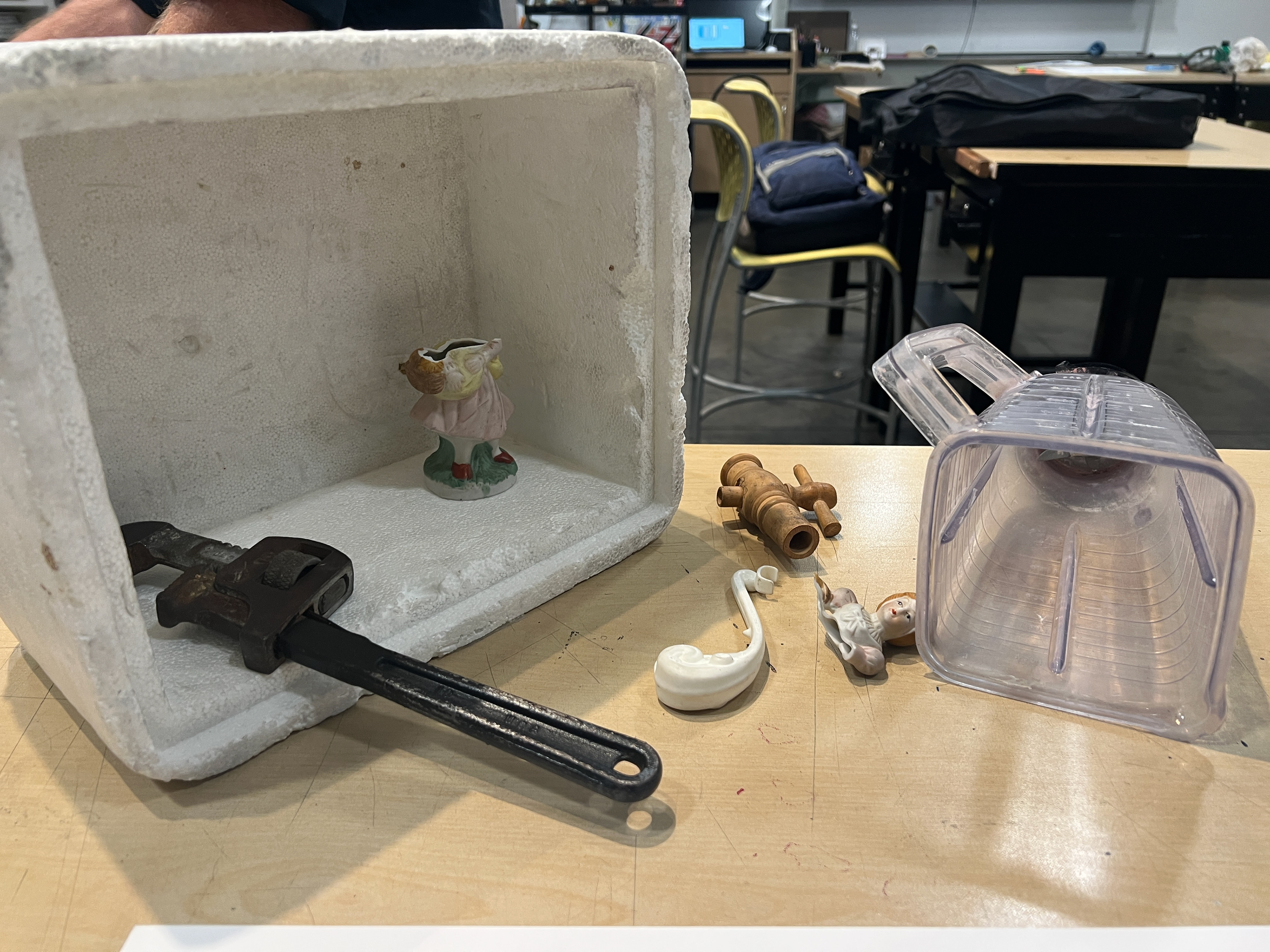 Using statues, figures, and weird objects in a classroom setting was weird. I used black india ink, microns, and brushes to create the fore, mid, and background of the objects I've used; a styrofoam box, blender, a handle, two pieces of the statue separated, a wrench and a weird wooden object I cannot discover to my own surprise.